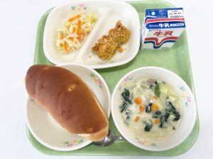 牛乳 キャロットパン クリスピーチキン フレンチサラダ ほうれん草といんげん豆のクリームスープ