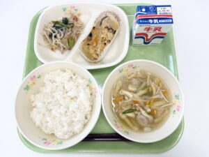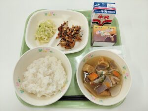 牛乳 ご飯 かき揚げ 酢物 けんちん汁 お祝いケーキ