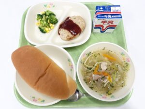 牛乳 コッペパン 豆腐ハンバーグのソースかけ ボイル野菜 キャベツとベーコンのスープ